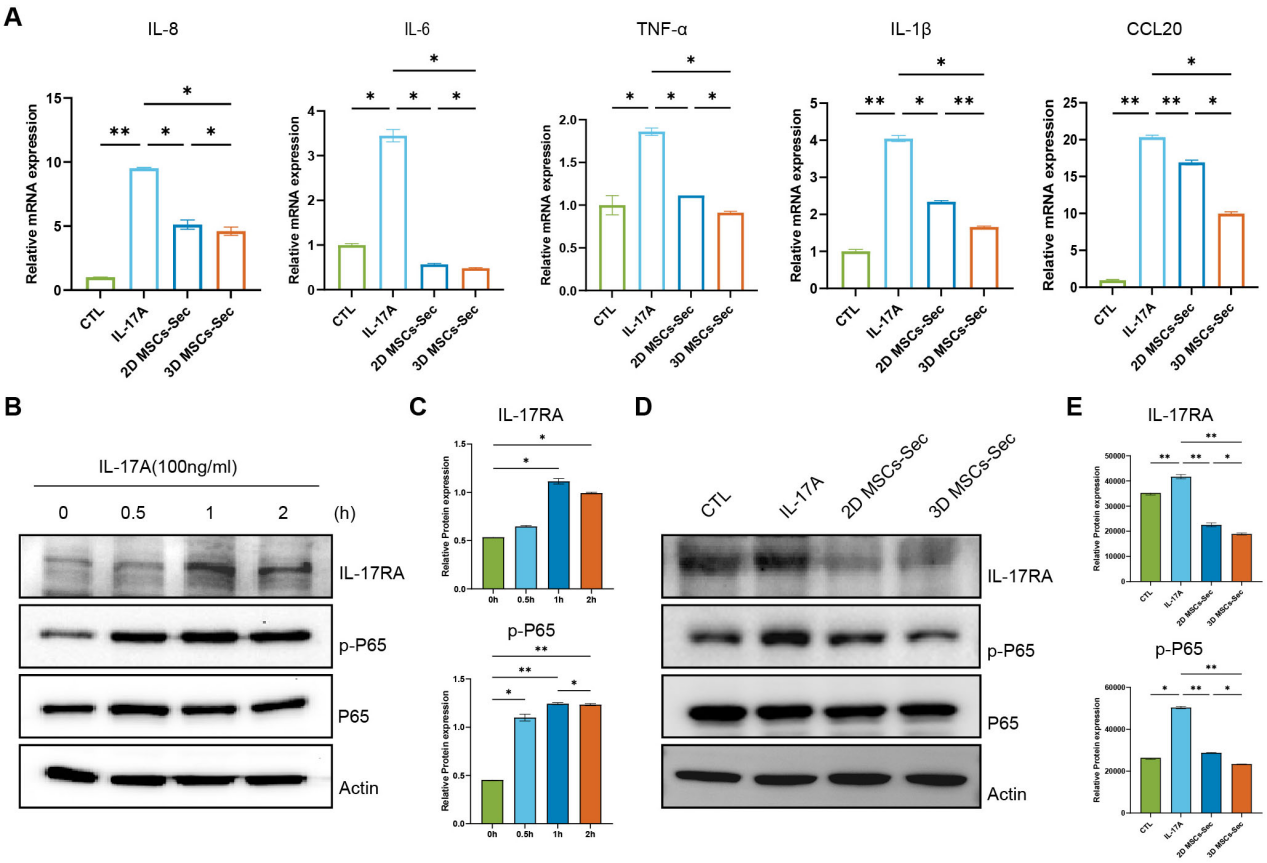 接着探究了3D-MSCs上清液(3D-MSCs-Sec)在体外人永生化角质形成细胞(HaCaT)对 IL-17A激活的 NF-κB 信号通路的抑制作用。结果显示,3D-MSCs-Sec可显著下调HaCaT细胞中炎症因子(IL-8、IL-6、TNF-α、IL-1β 及 CCL20)的mRNA 表达水平(Fig 5A)。且IL-17A可时间依赖性激活角质形成细胞的 IL-17RA/NF-κB 通路,IL-17RA及磷酸化 P65(p-P65)蛋白的表达随刺激时间延长明显升高(Fig 5B-C)。与2D-MSCs-Sec相比,3D-MSCs-Sec能更有效地降低 IL-17A 刺激后HaCaT细胞中 IL-17RA 和 p-P65 的蛋白表达水平,显著抑制 NF-κB 通路的激活(Fig 5D-E)。综上,hUC-MSCs 的上清液可通过抑制 IL-17RA/NF-κB 信号通路缓解角质形成细胞的炎症反应,且3D培养的 hUC-MSCs上清液的抑制效果优于2D培养组。