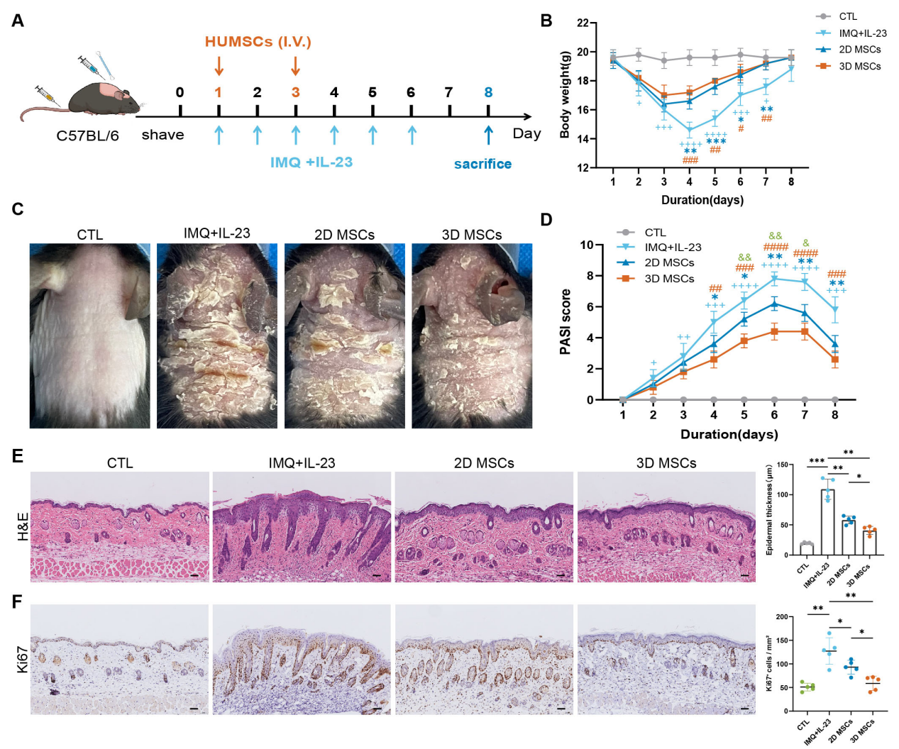 将C57BL/6小鼠随机分为对照组、咪喹莫特IMQ+IL-23模型组、2D-hUC-MSCs 治疗组和3D-hUC-MSCs治疗组,模型组连续7天背部涂抹咪喹莫特乳膏并皮下注射IL-23,治疗组在第1、3天尾静脉注射对应细胞(5×10⁵个cells/只),对照组给予凡士林和PBS处理,第8天处死小鼠收集样本(Fig 6A)。结果显示,在 IMQ+IL-23诱导的银屑病小鼠模型中,3D-hUC-MSCs 治疗组相较2D-hUC-MSCs 组和模型组,能更显著缓解小鼠体重下降,改善背部皮肤红斑、脱屑等表型异常,降低PASI(银屑病面积和严重程度指数)评分(Fig 6B-D);同时可有效减薄增厚的表皮,减少皮肤炎症细胞浸润,抑制增殖细胞标志物Ki67阳性细胞的异常增殖,整体治疗效果和病理改善程度均优于2D-hUC-MSCs治疗组(Fig 6E-F),证实3D-hUC-MSCs在体内对银屑病样炎症的缓解作用更显著。