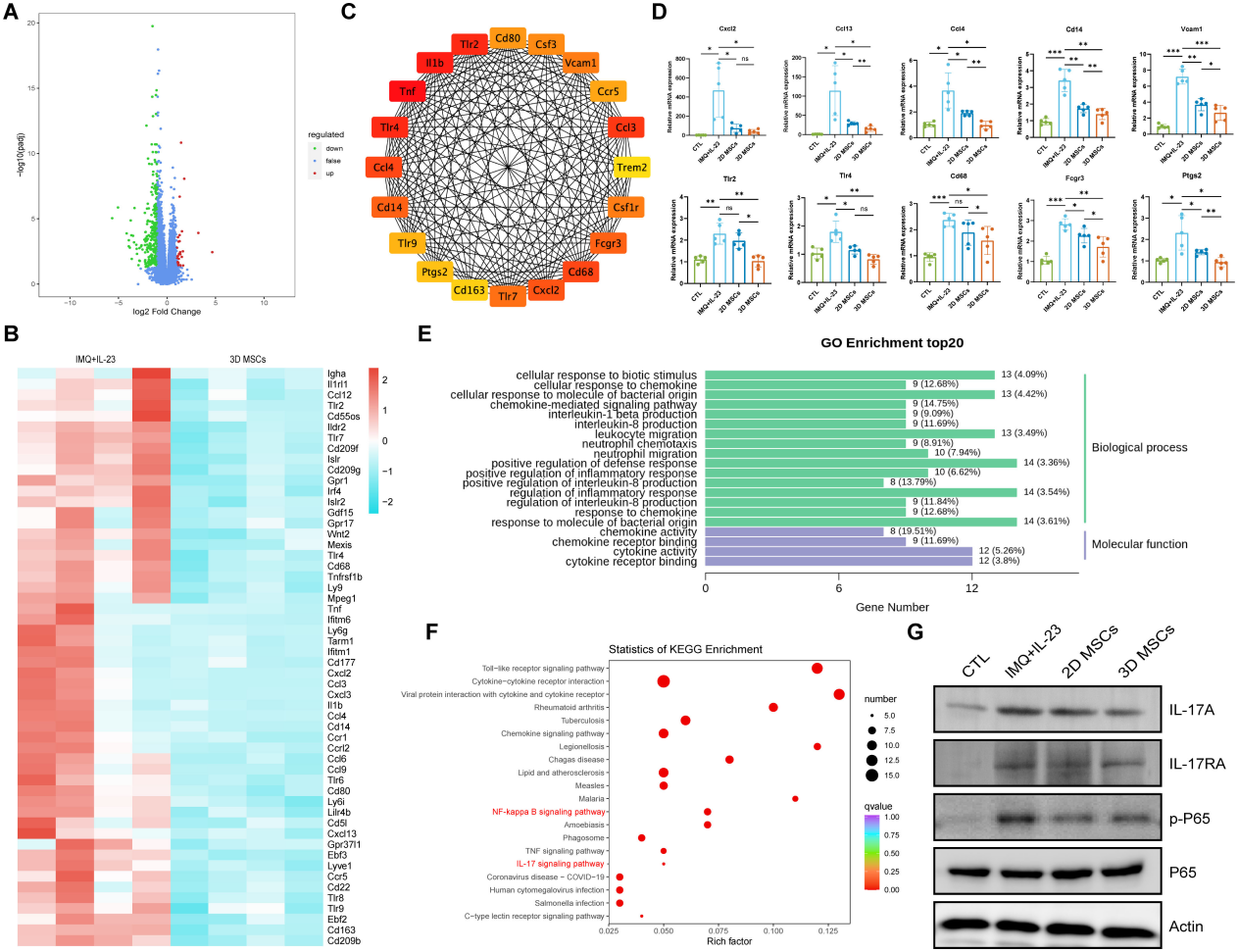 通过RNA测序(RNA-seq)探究3D-hUC-MSCs 调控银屑病样炎症的分子机制。相较于IMQ+IL-23模型组,3D-hUC-MSCs治疗组有 324个基因表达显著改变(291个下调、33个上调),且下调基因多与炎症相关(Fig 7AB);蛋白质 - 蛋白质相互作用(PPI)网络分析筛选出20个下调核心基因,这些基因可能通过协同作用调控银屑病病理过程中的炎症反应与免疫调节(Fig 7C);RT-qPCR 验证了排名前10的关键下调基因,进一步证实其在 3D-hUC-MSCs 治疗中的重要性(Fig 7D)。功能富集分析表明这些差异基因参与信号转导、先天免疫反应等过程,且富集于NF-κB、IL-17等关键炎症通路(Fig 7EF);Western blot验证显示,3D-hUC-MSCs可显著降低小鼠皮肤组织IL-17A、IL-17RA及 p-P65的蛋白表达(Fig 7G),证实IL-17/NF-κB信号通路是其调控银屑病样炎症的核心靶点,3D-hUC-MSCs通过下调炎症相关基因、抑制该通路激活发挥治疗作用。