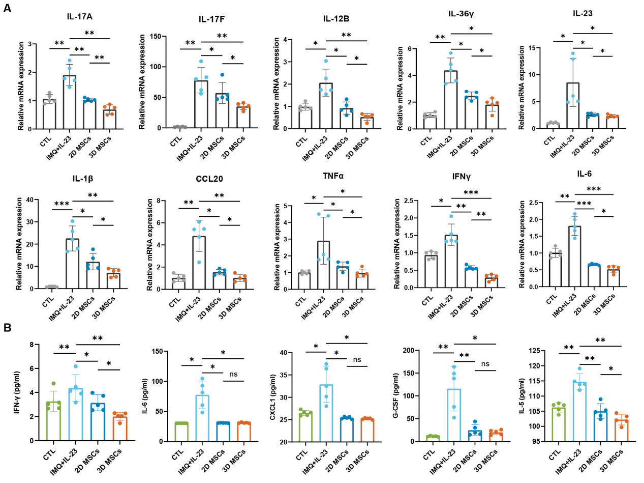 RT-qPCR 检测显示,与 IMQ+IL-23 模型组相比,3D-hUC-MSCs治疗组小鼠皮肤组织中 Il-17A、Il-17F、IL-12B、IL-23、IL-36g、IFN-γ、IL-6、TNF-α、IL-1β 及CCL20 等基因的mRNA 表达水平显著降低(Fig 9A)。ELISA检测证实,3D-hUC-MSCs 治疗后,小鼠血清中 IFN-γ、IL-6、CXCL1、G-CSF 及 IL-5等促炎因子的表达量明显下降,与皮肤组织中细胞因子的下调趋势一致(Fig 9B)。
