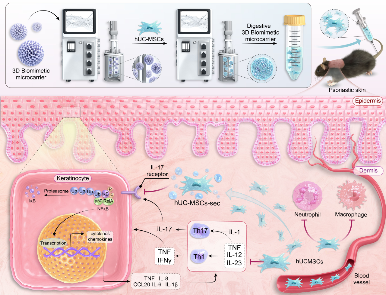 该研究证实,基于3D仿生微载体的培养系统可显著提升hUC-MSCs的增殖能力、干细胞特性及免疫调节功能,且维持其基因组稳定性与多向分化潜能,通过抑制 IL-17/NF-κB 信号通路、减少免疫细胞浸润及促炎因子产生,在体内外对银屑病样炎症的治疗效果优于传统 2D 培养的 hUC-MSCs,为自身免疫性疾病治疗、再生医学等领域提供了高效的 MSC制备策略。
