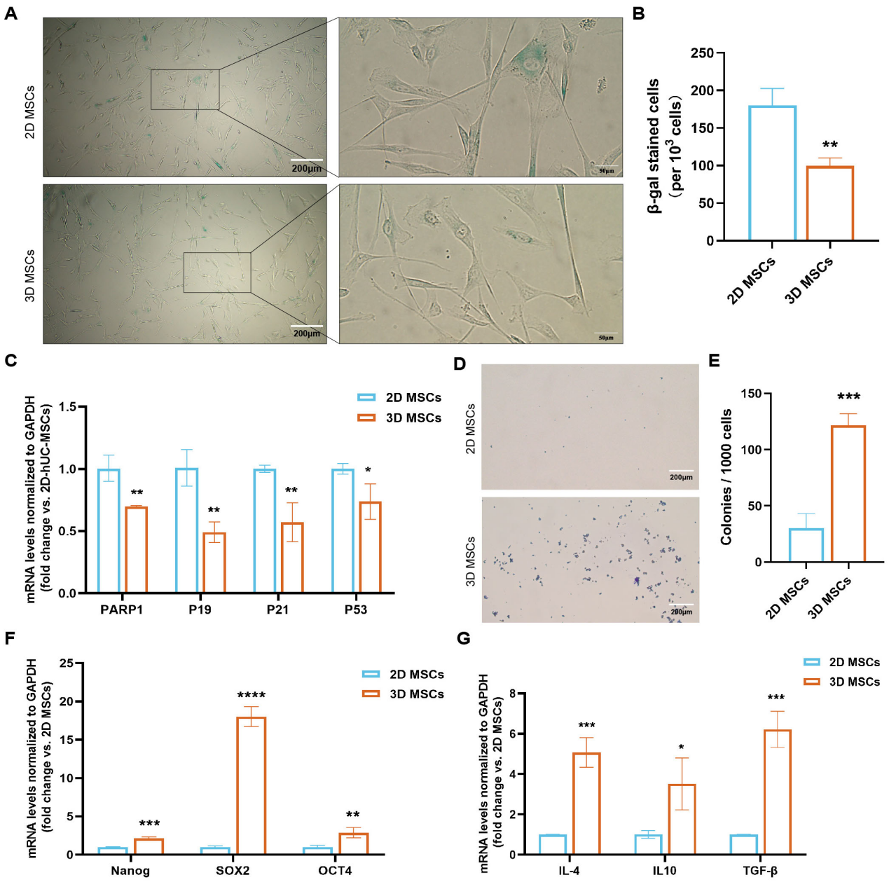 继续评估2D与3D培养的hUC-MSCs在细胞衰老、活力、多能性及免疫调节因子表达方面的差异。经β-半乳糖苷酶染色分析,3D-MSCs衰老细胞占比未升高(Fig 4A-B);且衰老相关标志物 PARP1、P19、P21、P53 的 mRNA 表达水平显著低于 2D-MSCs(Fig 4C)。3D-MSCs的成纤维细胞集落形成单位(CFU-F)数量较2D-MSCs显著增加(Fig 4D-E)。RT-qPCR 检测显示,3D-MSCs中多能性标志物 OCT4、SOX2、NANOG的 mRNA 表达水平高于2D-MSCs(Fig 4F)。3D-MSCs中免疫调节及抗炎因子 IL-4、IL-10、TGF-β 的 mRNA 表达水平显著升高,表明其抗炎和免疫调节能力更优(Fig 4G)。综上,3D培养条件可有效减少 hUC-MSCs 的衰老,增强其增殖活力、多能性及免疫调节功能,优于传统2D培养方式。