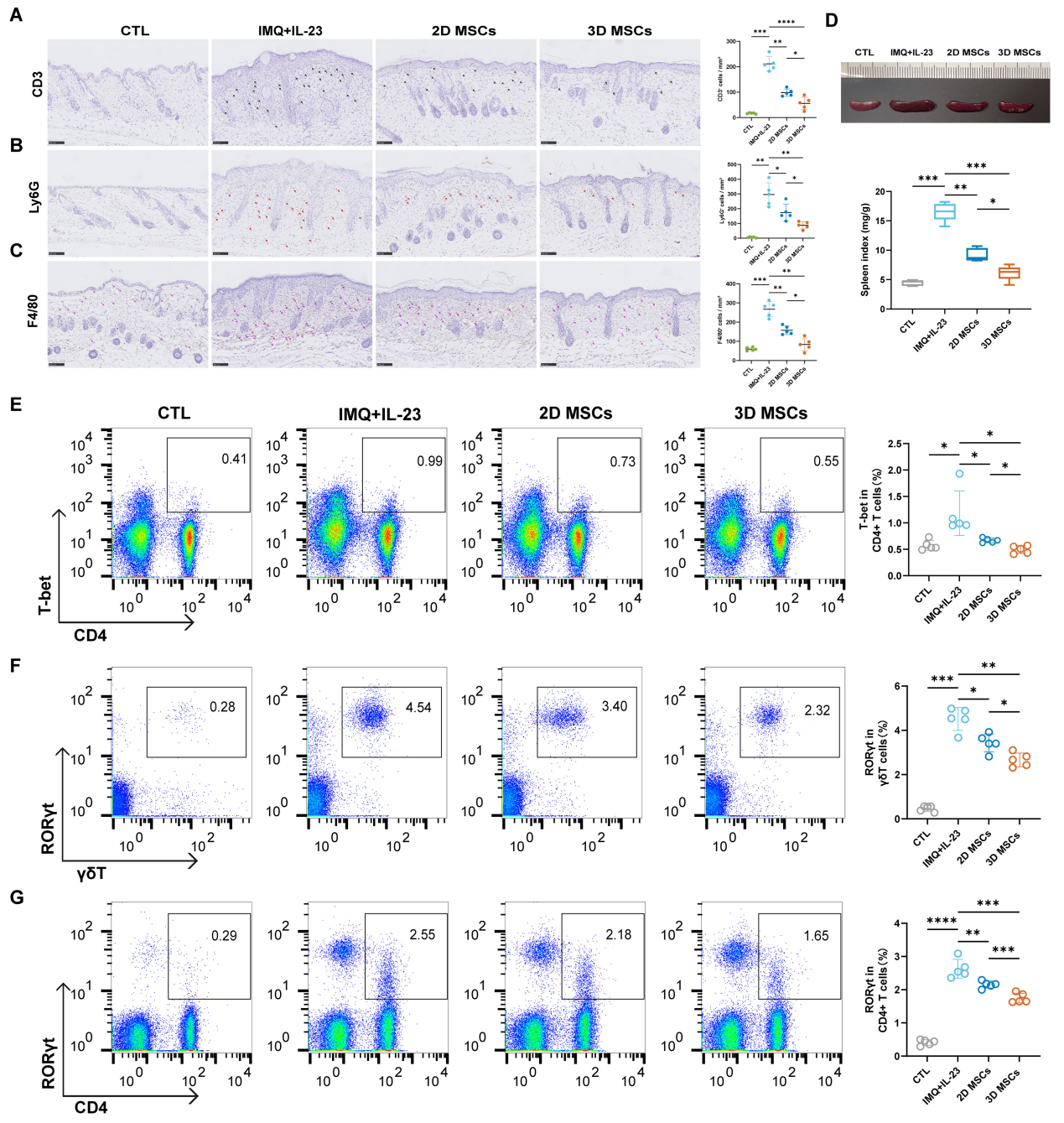 为探究3D-hUC-MSCs缓解银屑病的作用机制,在第8天对小鼠皮肤微环境进行了评估。免疫组化分析显示,3D-hUC-MSCs 能显著减少 IMQ+IL-23诱导的银屑病模型小鼠皮肤中 CD3+T细胞、Ly6G+中性粒细胞及 F4/80+巨噬细胞的浸润(Fig 8A-C)。脾脏指数(衡量脾脏重量与体重的比值,作为炎症严重程度的指标)在3D-hUC-MSCs处理的小鼠中降低(Fig 8D)。流式细胞术分析显示,与模型组相比,3D-hUC-MSCs治疗组小鼠淋巴结中T-bet+/CD4+ T细胞、RORγT+/CD4+ T细胞及 RORγT+/γδT细胞的百分比和绝对数量均显著减少,表明其可抑制 T细胞增殖并调控 Th1、Th17细胞应答(Fig 8E-G)。