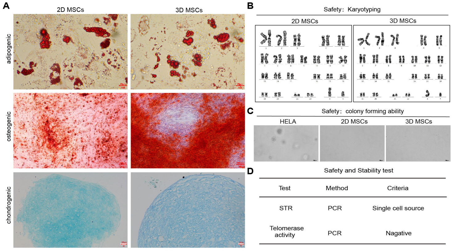 接着,分别评估了2D-MSCs、3D-MSCs的细胞质量和安全性。3D-MSCs仍具备向脂肪细胞、成骨细胞和软骨细胞分化的能力,分化潜能未受影响(Fig 3A)。核型分析显示,3D-MSCs的染色体结构/数量无异常,基因组保持稳定(Fig 3B)。软琼脂集落形成实验表明,3D-MSCs无克隆集落形成,且端粒酶活性检测结果为阴性,证明其无致瘤风险(Fig 3C-D)。短串联重复序列(STR)分析表明,3D-MSCs未受到其他细胞污染,细胞来源单一(Fig 3D)。 综上,3D培养条件可维持hUC-MSCs的多向分化潜能、基因组稳定性和无致瘤性,其核心质量与2D培养的细胞一致,安全性得到验证。